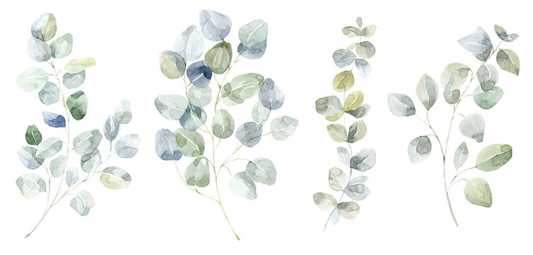 Green Eucalyptus Branches Set. Watercolor Illustration.
