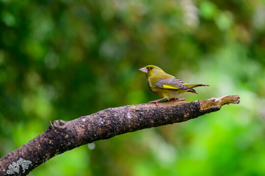 Male Greenfinch, Chloris chloris, perched on a branch.