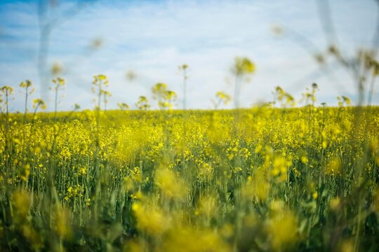 Field of colza rapeseed yellow flowers and blue sky, Ukrainian flag colors