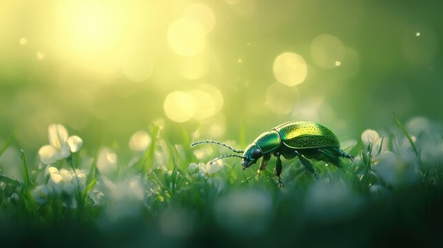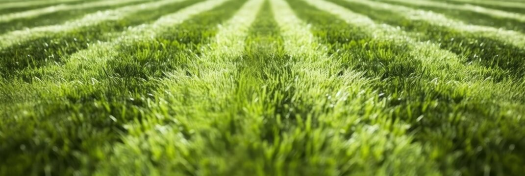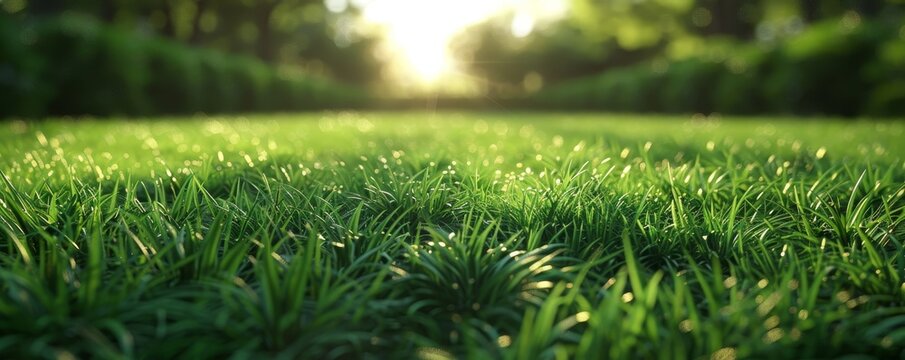Beautiful wide format natural background macro image of young juicy green grass in bright summer spring morning sunlight