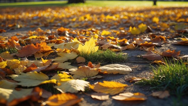Autumn leaves scattered on the ground with green grass peeking through. Fall season scenery, outdoor environment, natural landscape. The scene of fallen leaves during autumn.