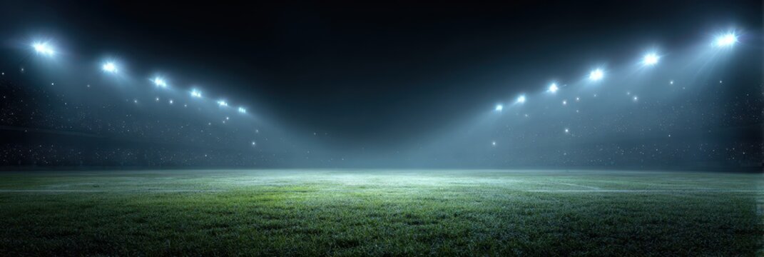 Illuminated Sports Arena: Nighttime Stadium Lights on Green Grass Background