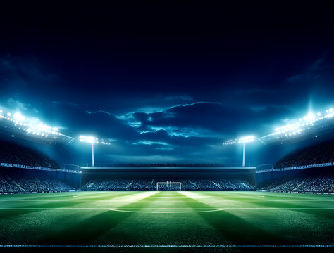 Football field with spotlight, green grass and night sky, Soccer stadium field, soccer background