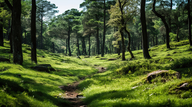 Autumn leaves on green grass in a park landscape with natural sunlight. Fall season scene. Nature and seasonal change. The beauty of autumn.