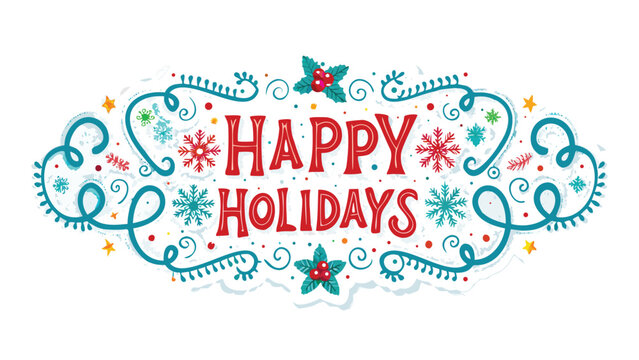 Festive happy holidays message with snowflakes holly berries and decorative swirls on a white background