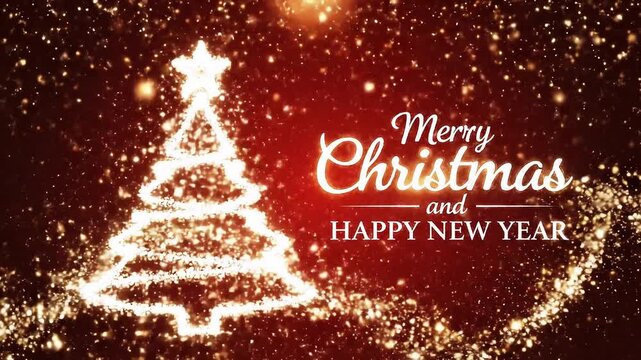 sparkling lights xmas tree Merry Christmas and Happy New Year greeting message in english on red background,snow flakes.Elegant animated holiday season social post digital card 4k video