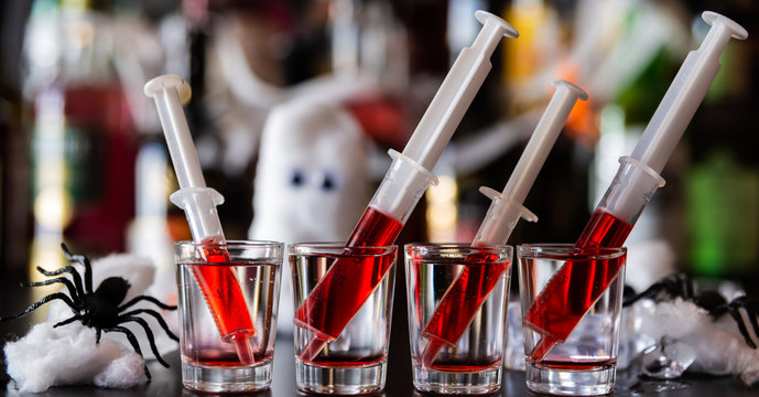 creepy halloween party cocktails with syringes of grenadine syrup as blood, shot drinks at party