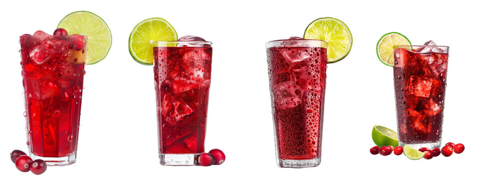 Four different drinks with a lime slice in each. The drinks are all red and have a frosty appearance isolated transparent background