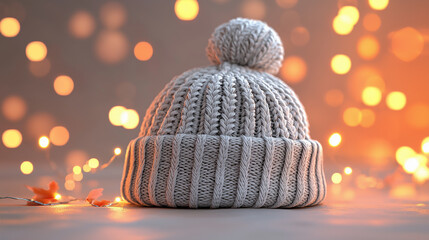 Close-up of a grey knitted beanie with a fluffy pompom.
