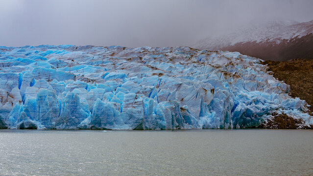 he majestic blue ice peaks of the Grey Glacier contasting with the Andes mountain peaks by Grey Lake (Lago Grey) inside Torres del Paine national park, Patagonia, Chile.