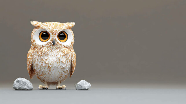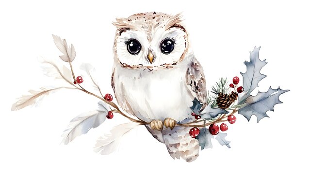 Watercolor illustration of a Boho-style Christmas owl, adorned with festive accessories such as a small wreath and feathers. The owl is painted in soft hues like light gray, beige, and soft