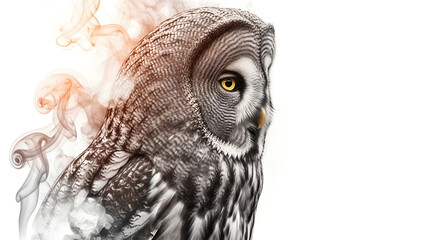 Majestic Great Grey Owl Portrait: Smoky Abstract Background, Serene and Mysterious Wildlife Image