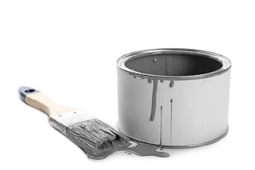Can of grey paint and brush on white background