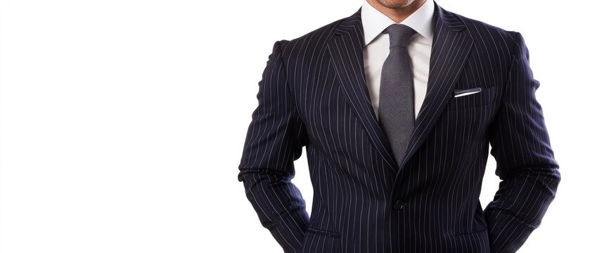 fashionable and handsome man with bare chest and feet posing in pinstripe suit on grey background