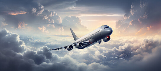 grey airplane flying over dark clouds. Surreal holidays concept. Generative AI