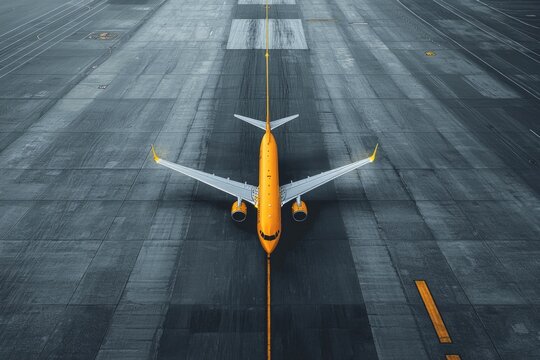An ultramodern grey airport runway with expansive grey tarmac and sleek lines is highlighted by a single, vibrant yellow airplane, standing out against the monochromatic backdrop.