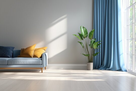 High-definition  image of a stylish living room with blue curtains, light grey walls, and modern decor including a plant in the corner