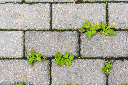 Close-up view of grey road setts (paving stones) with Plantago plants (commonly called plantains or fleaworts) growing between them. Abstract textured background.