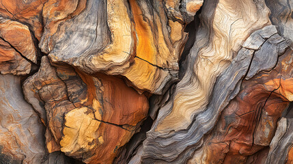 A close-up view of cracked desert bark showcasing intricate patterns and rich colors ranging from warm browns to vibrant orange and soft grey shades