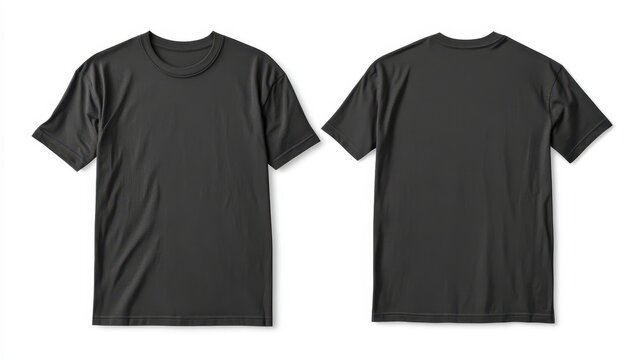 2 Set of dark light grey tee t shirt round neck front, back and side view on white background cutout, PNG file. Mockup template for artwork graphic design.