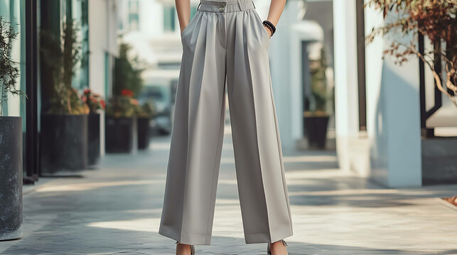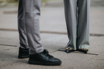 Two people in smart attire stand on a pavement, one in grey trousers and the other in metallic pants with chain details, projecting modern, stylish business vibes and confidence.
