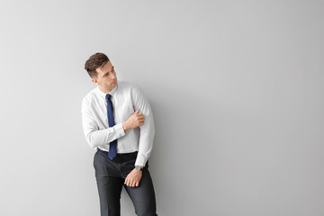 People in stylish jeans near light grey wall indoors, closeup