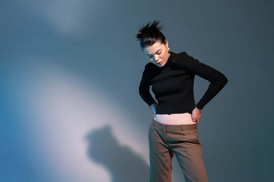 young brunette woman in black sweater and brown trousers standing with hands on hips on grey background.