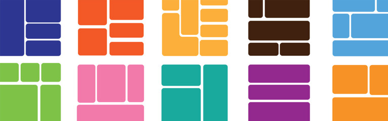 Bento box template. Y2K collage grid shapes. Geometry modular moodboard frames. UI design elements border. Label textboxes composition pack. Trendy blocks blank layout. Vector flat illustration.