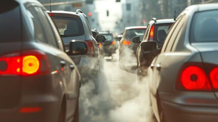 Traffic jam on a busy city street with heavy vehicle emissions, pollution, congestion, exhaust fumes, smog, gridlock