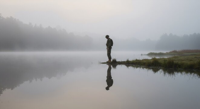 Solitary man reflecting by misty lake at dawn. Peaceful nature scene for Veterans Day, Memorial Day, or PTSD awareness. Contemplation and healing concept.