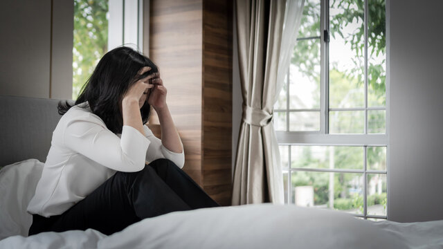 Panic attack business woman, stressful depressed emotional jobless businesswoman with anxiety disorder mental health illness, headache and migraine sitting on bed at home