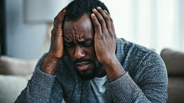 A man sits on a couch, his hands on his head, looking distressed