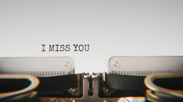 Old mechanical typewriter typing I Miss You Greatly in a close-up view, with metal letters striking the white paper.
