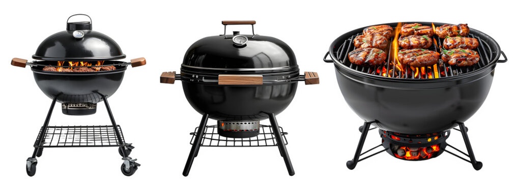 Barbecue equipment. Charcoal and gas kettle BBQ grill equipment different type for meat and sausages cooking outdoor. Home or restaurant appliance. Vector illustration.