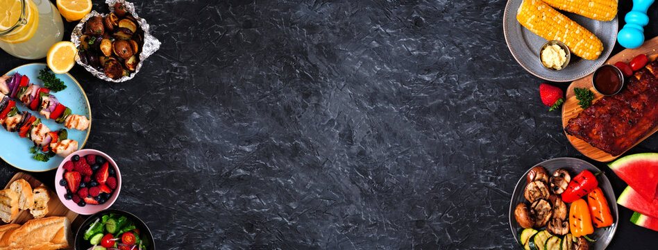 BBQ or summer picnic food double side border over a dark stone banner background. Various grilled meats, vegetables, fruits, salad and potatoes. Top down view with copy space.