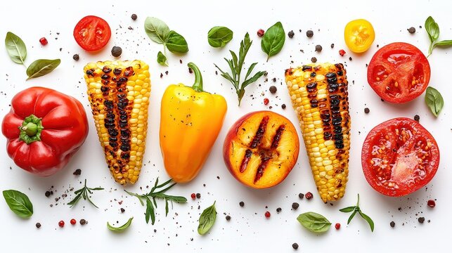 Flat-style arrangement of BBQ fruits and vegetables, including smoky grilled peaches, corn on the cob, and bell peppers, isolated on a clean white background.