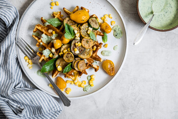 A plate of waffles topped with grilled zucchini, yellow cherry tomatoes, corn, and fresh basil, accompanied by a green sauce and a bowl of sauce on the side.