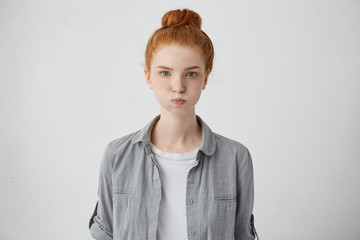 Portrait of grumpy woman with freckled face, blue eyes, ginger hair and eyebrows blowing her cheeks being dissatisfied with her results. Pretty red-haired girl making grimace having upset look