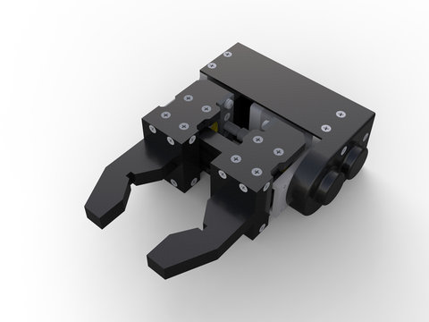 Close-up of a silver industrial robotic gripper arm with open jaws on a bright background, symbolizing precision and automation