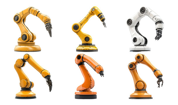 Collection of Six Industrial Robotic Arms on Transparent Background