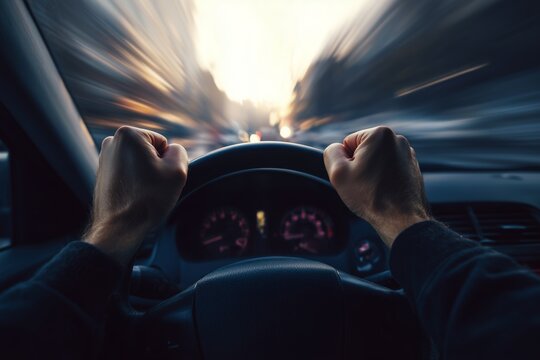 A person driving a car at high speed, with hands gripping the steering wheel. The motion blur outside the window conveys a sense of speed and excitement.