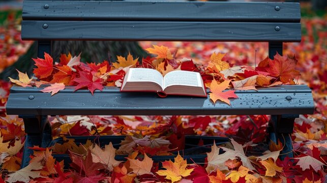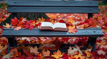Open book on bench with autumn leaves background