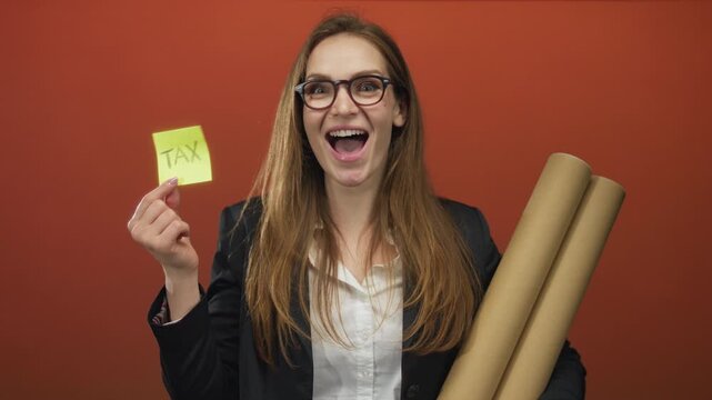 Woman holds sticky note labeled tax and grips cardboard tubes against orange backdrop in studio; tax excitement.