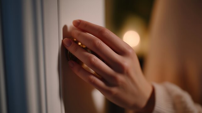 Close-up of fingers gripping doorknob with subtle ambient lighting — representing curiosity, suspenseful mood, and lifestyle or creative narrative imagery. cinematic color correction, natural
