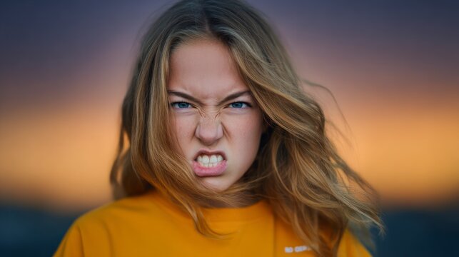 Young girl with blonde hair and blue eyes showing an angry expression and gritted teeth