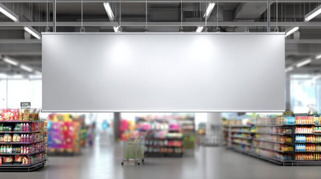 Blank Banner Mockup Hanging in Supermarket Aisle, Ready for Advertising Campaign, Retail Store Interior, Copy Space