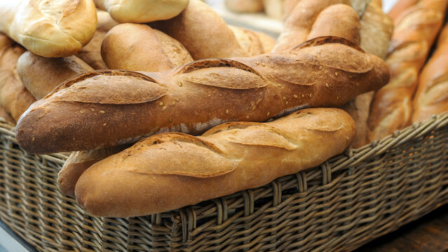 Reaching, blue-top woman in light apron holding woven-basket in market showing financial overlay