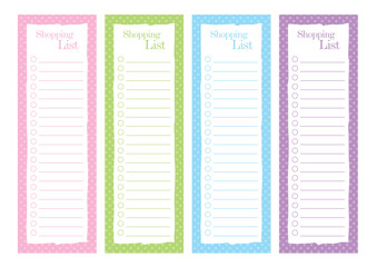 Shopping list template set. Cute pink grocery list with cat and strawberry illustrations.