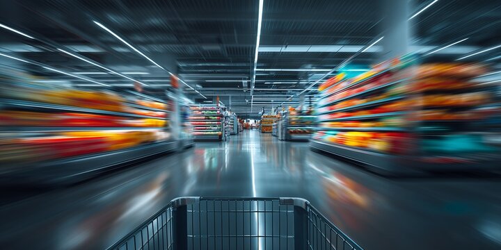 Blurry supermarket aisle view with cart in motion, concept for retail promotions, grocery store advertising and seasonal marketing