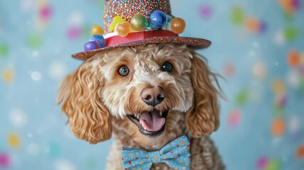 Happy dog wearing a party hat with colorful confetti on a blue background